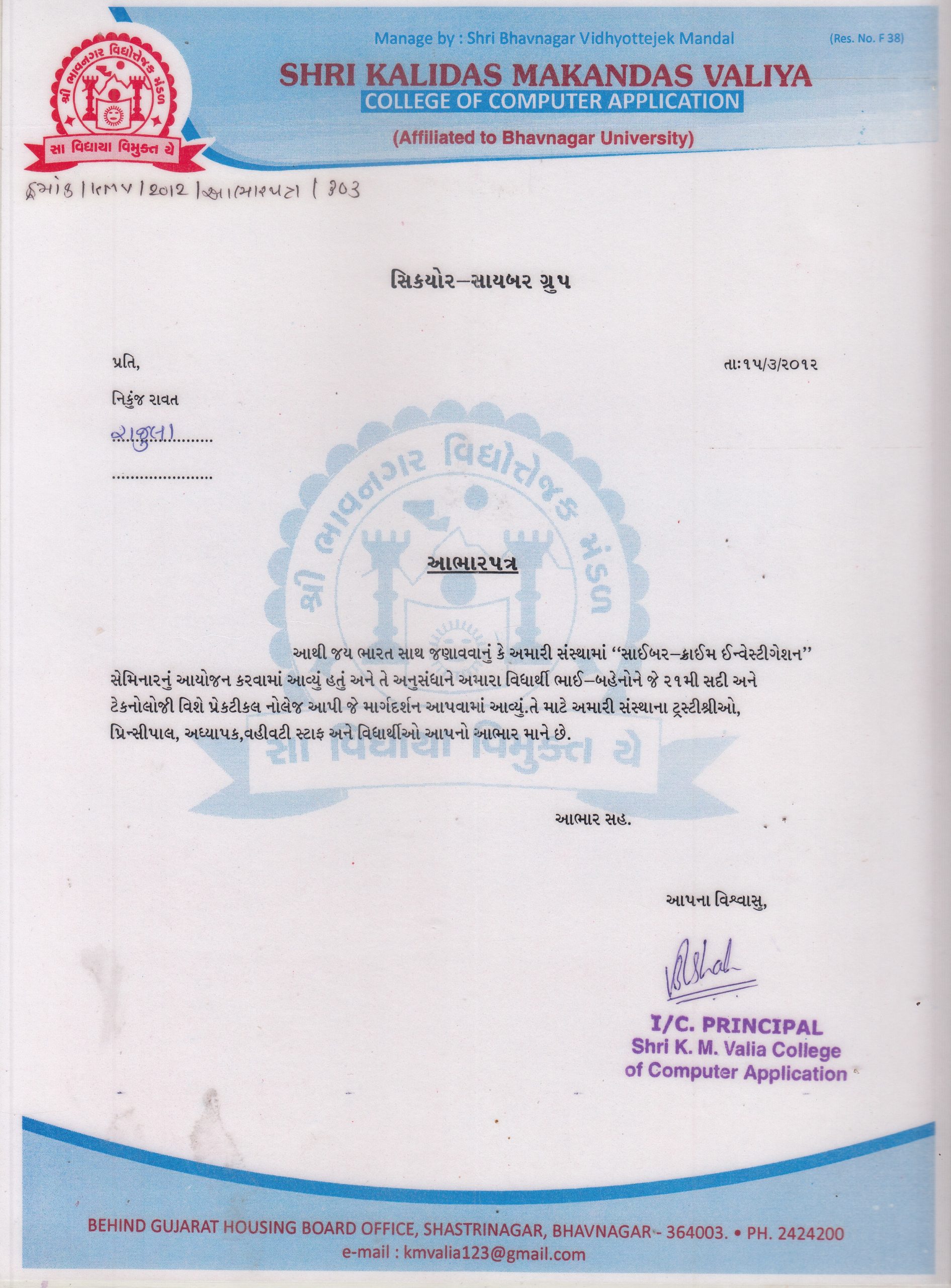 15 March 2012 Shri Kalidas Makandas Valiya College, Bhavnagar